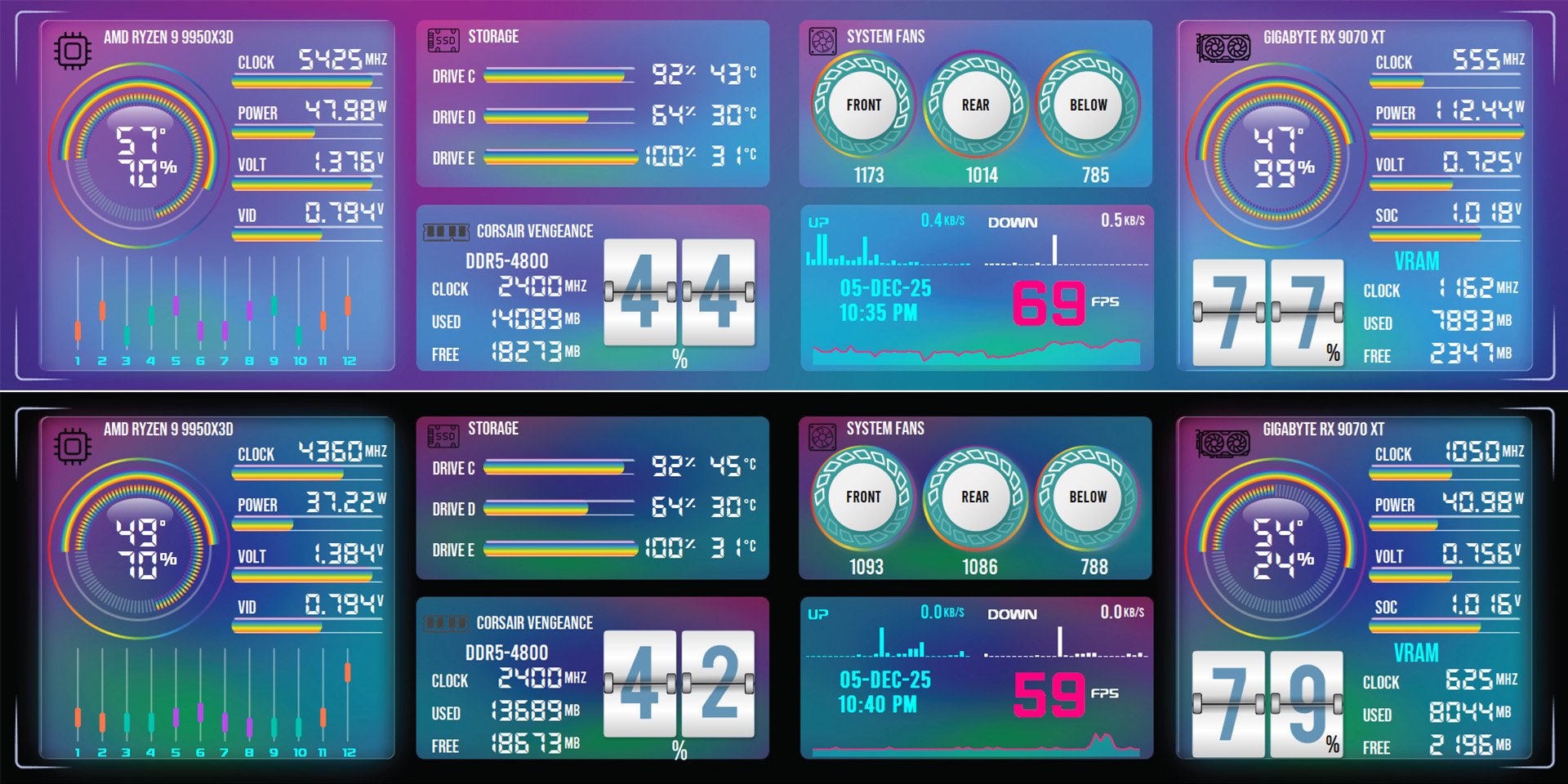 Step Into the RGB Era with “PrismShift Vitae - R8”! Size: 1920x480 with two colours BG! Need a custom fit? Your panel, your way - tailored dimensions on request: 3840x1100 | 1280x800 | 1024x768 | 1920x720 | 1920x1080 & more! Precision > Crafted: Temperature: CPU · GPU: 100 States Utilization: CPU · GPU · RAM · VRAM: 100 States Note: Requires AIDA64 v7.70.7500 or Beta v7.99.7829 or above. Please click here to send me a PM to claim your exclusive Sensor Panel. Rise Beyond Limits - Precision engineered for minds that dare. Find the full experience on my webpage: Surjeet Skins Turning Every Byte Into Beauty! As per the Frum rules: Added one image only: