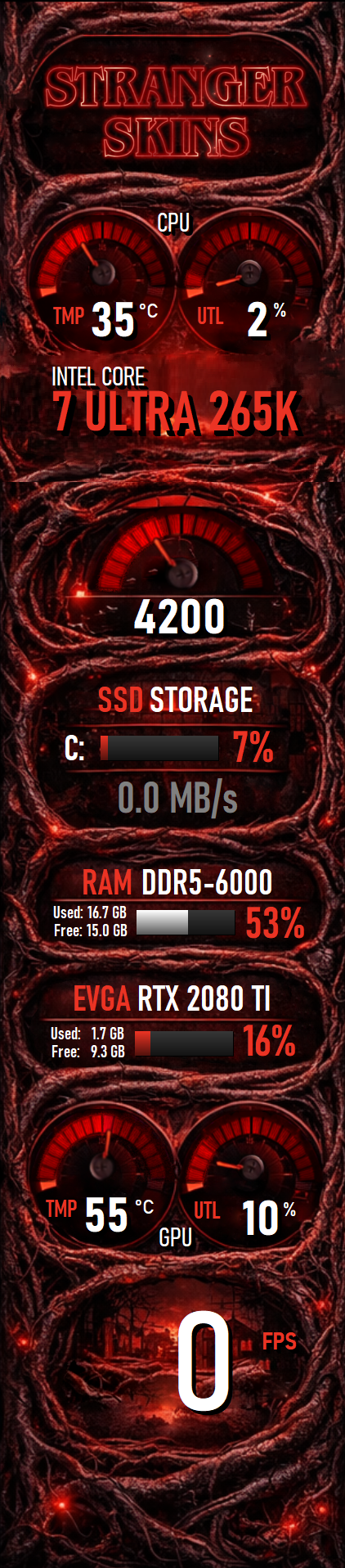 STRANGER SKINS DEBUT Let's see what kind of interest folks have in this new AIDA64 SensorPanel skin I recently created for my custom build. Currently it's setup for a 11.3" 440x1920 vertical panel layout, but depending on interest can re-work for other sizes/orientations. Features: Stranger Things series inspired theme Custom 16 state gauges Open space for system info, branding etc. Setup currently for 440x1920 Please message me for any questions or interest.