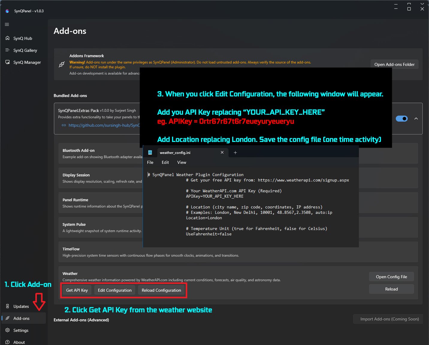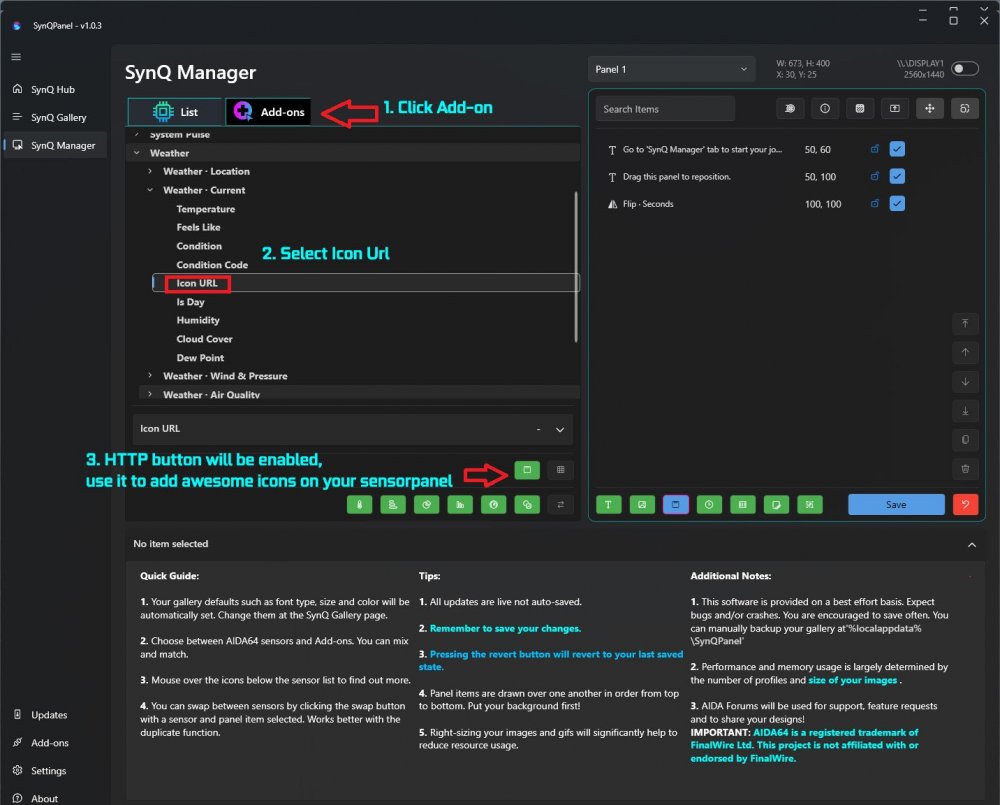 @BHSY @Loyd Hi Everyone! I am excited to announce 🎤 that 🎉SynQPanel v1.0.3 is now available.🎉 ❤️ So many New Things ❤️ Runtime Data Storage & Stability Added configurable runtime data folders for assets, logs, and cache, while keeping profiles and settings in AppData for safer upgrades and backups Improved XML parsing robustness to better handle malformed or partial files without crashing Hardened shared-memory handling to reduce the risk of corruption-related crashes and improve long‑running stability Added New add-ons: TimePulse: Introduced the TimePulse add-on to drive time-based triggers and visual pulses for panels Enables creating more dynamic, rhythm-based visual elements that react to seconds, minutes, or custom time intervals Weather: Added a Weather add-on powered by WeatherAPI.com, exposing current conditions, detailed daily forecasts, air quality, and astronomy data Added multiple icon URL sensors (current, today, tomorrow, hourly) to build rich weather widgets with live condition icons on the sensorpanel Added Flip Clock: Implemented a standalone Flip Clock mode that runs independently and renders smooth flipping digit animations without relying on external data sources Provides smooth flipping digit animations suitable for use as a primary time widget or background clock Improvements and fixes: Improved HTTP image caching so plugin-provided icon URLs stay in memory reliably without premature eviction or disposed-image errors Refined plugin sensor UI so the \"Add Http image\" action is only enabled for URL-based sensors, including the new weather icon sensors Fixed CPU fan selection issue that was switching to a different sensor source General minor stability and UX improvements across plugins and the rendering pipeline 📢 Recommended update for all users. Thank you to the AIDA team and community for feedback, suggestions and logs that helped refine this release. 🙏 The update is available on GitHub here: https://github.com/sursingh-hub/SynQPanel/releases/tag/v1.0.3 Feedback and suggestions are always welcome. 🙏 Thank you again for the support! 🙏 I am not a designer but I tried something below> Please use the steps and let me know if you have any questions: Flip Clock: Please use images named from 00 to 59.png only Weather Settings: Adding amazing looking icons for weather/time conditions etc. that will change automatically:3 points