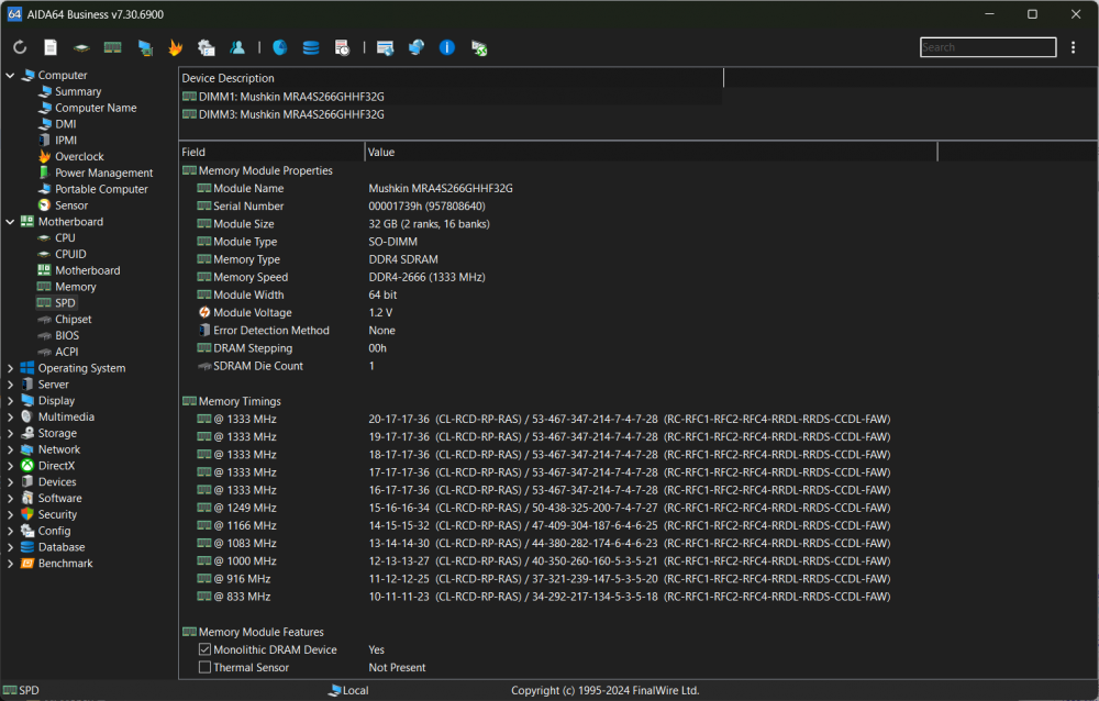 Many thanks, appears to be working in AIDA64 Business Edition v7.70.7500 but slightly different than v7.30 as v7.30 seems to show all JDEC profiles for a given frequency which in this case is 1333MHz which would be more detailed and complete compared to v7.70 which appears to only show one: