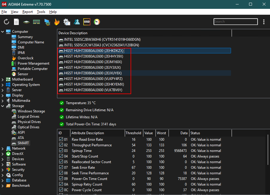 System: AMD 5700G, Asus B550-F, Adaptec ASR 8805 raid card, 8 * HGST HUH728080ALE600 Problem: Aida64 7.70.7500 was able to retrieve, among other things, the RAID and Smart information of the Adaptec ASR 8805. The necessary stability checkmarks are turned on but Aida64 8.00.8000 and later versions do not show the Smart data of the disks connected to the Adaptec ASR 8805. See the screenshots of the 2 Aida64 versions running the same aida64.ini file and the missing information. raiddump_aida64 8.00.txt raiddump_aida64 7.70.txt smartdump_aida64 8.00.txt smartdump_aida64 7.70.txt