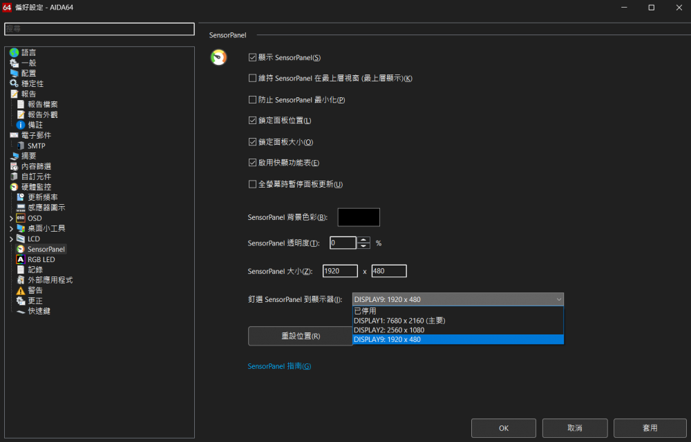 My setup includes three monitors, one of which is a small USB-connected display (1920×480) mounted inside the PC case and dedicated to the Sensor Panel.