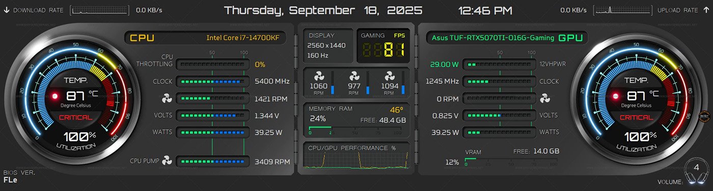 45_1920x480_Type1 | 45_1920x515_Type1 | 45_480x1920_Type1 | 45_515x1920_Type1 CPU/GPU temperature, and utilization using 100 states. Memory RAM/Video memory utilization, and RAM temperature using 100 states Fans using 15 states. 45_1920x480_Type2 | 45_1920x515_Type2 | 45_480x1920_Type2 | 45_515x1920_Type2 CPU/GPU temperature, and utilization using 100 states. Memory RAM/Video memory utilization, and RAM temperature using 100 states Volume and mainboard temperature using 100 states. Storage drives utilization and temperature using 15 states. Visit https://www.bhsysensorpanel.net/ for more info.