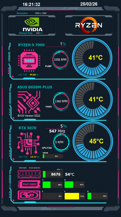GoatBlaster Posted February 14 Posted February 14 It's been a while since I've updated my sensor panel, so thought I'd post my latest updated version. It's a 2560x1600 panel that I use with an old Samsung tablet, through USB Cable / Spacedesk app. Since the last update, I've added the memory badge, moved a few things around, tweaked some alignments, and upgraded from a 3070 to a 5070 Ti, so changed that badge too and adjusted the bars. As mentioned in my last post months ago, I take no credit for its initial creation, I found it on here hundreds of posts ago somewhere as a 1280x800 res version, so took it, modified it to suit my needs and monitoring preferences. If you need different badges for your RAM, MB, CPU or GPU, just do a Google image search for like "4090 badge" and voila. What I've been doing is grabbing the image that way, slapping it into MS Paint, reducing the white borders, save it and then I upload it to the remove.bg website to remove the white border / background, then download and post it into the sensorpanel. Anyway, the .sensorpanel file is attached below. Enjoy! Also open to recommendation (e.g., I know the storage area could use some work...!) 2026-02-14.sensorpanel 3 Quote