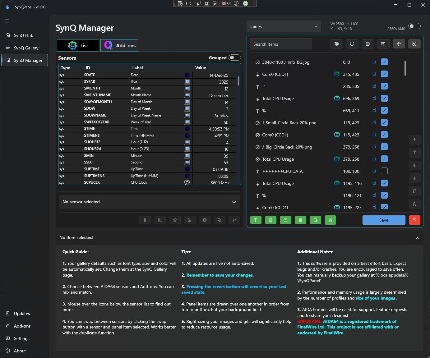 Trouvist Posted September 27, 2024 Posted September 27, 2024 So anyone who ever looks at these forums might want a different way to load up a sensor panel, and ALSO uses Aida64 as their hardware monitoring software. I've developed a client/server set of tools to get the shared memory from Aida64 and host them for a client webpage. Currently the client-side html is just 1 example page, but since it's Javascript and HTML, it's pretty trivial to do whatever you want to do with it. Check out the link below to see what it currently looks like... https://github.com/MarkVabulas/ultimon I'm currently using this software (for myself) on a Raspberry Pi, mounted inside the glass in my case. The animations and live updates look great. If you'd rather do editing of your sensor panels outside Aida64's interface, which is pretty rough, then you're welcome to try what I made. Keep in mind, you still have to have Aida64 running! It just gets the values from shared memory and then shoots them to a client you control. Because it's a browser-based webpage you have full control over, including at the source, you can literally have it display whatever you code up. I'm currently working on additional panels, and if people want to submit them for adding to the site, I'd be happy to include them, and any plugins, to make it easier to use. On the roadmap is having WebGL-based updated visuals, so you can have 3D renderings that respond in real time to sensors, not just static images. Additionally, there's no limit to the fidelity of your images, so you won't be limited to just 16-images anymore, you can make it show whatever you like. 1 Quote